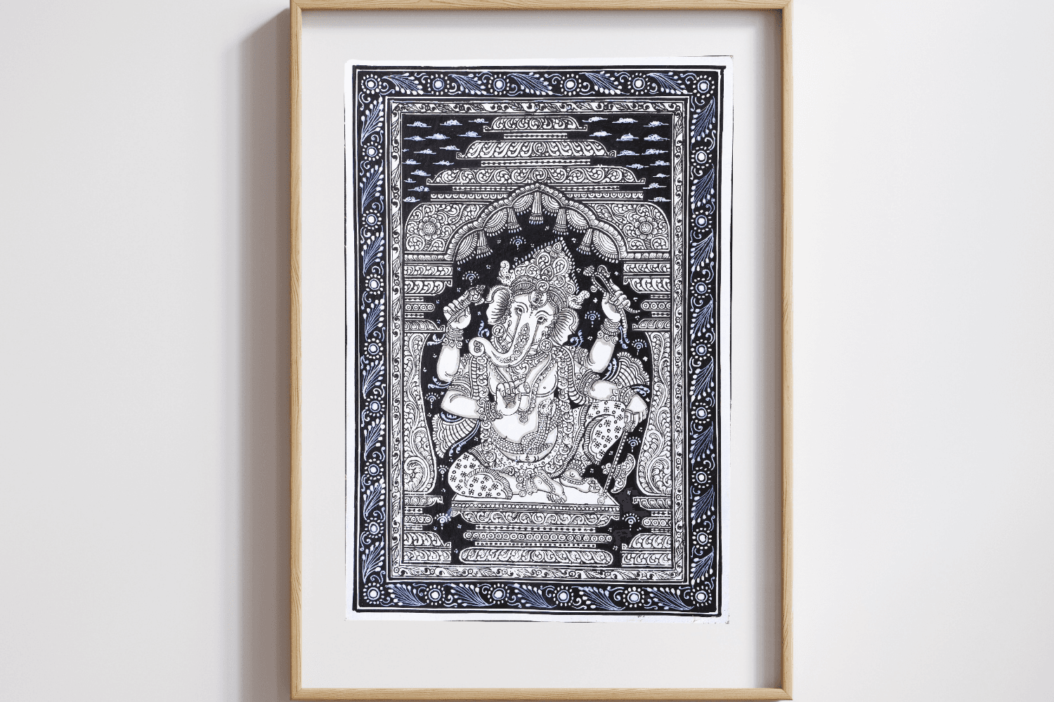 Painted on handmade patta (traditional treated cloth), prepared to achieve a smooth, resilient surface. Natural and mineral-based pigments are hand-mixed to produce deep blacks, soft whites, and subtle tonal variations. Pigments are applied in carefully controlled layers to preserve crisp line quality and long-term stability.